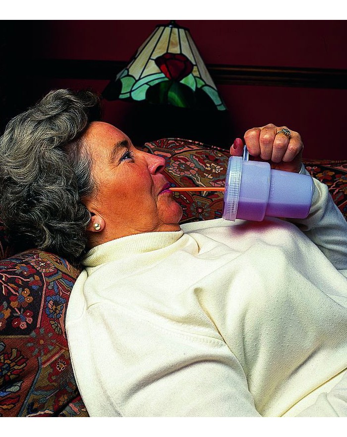 Cette tasse est idéale pour boire en position allongée. Placez simplement une paille pliable à l'envers dans la tasse pour boire allongé. Le couvercle permet l'insertion d'une paille interne permettant de ne pas renverser de liquide.
