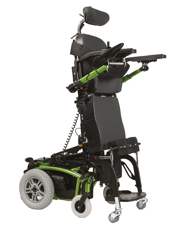 Fauteuil électronique verticalisateur avec fonction Stand-up. 3 positions : position assise, verticale ou horizontale. Dossier électrique inclinable. Palette repose-pieds monobloc avec roulettes anti-bascule. Éclairage avant et arrière de série. Vitesse : 6 km/h. Batteries : 2 x 12 V - 80 Ah. Moteurs : 2 x 220 W. 2 largeurs d'assise : 40 et 45 cm. Poids : 165 kg. Poids max. : 130 kg. Version AA2.