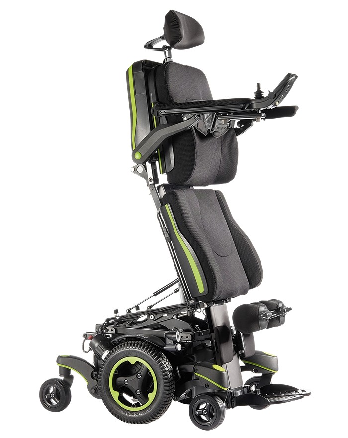 Fauteuil verticalisateur multiposition suspensions indépendantes aux 6 roues.