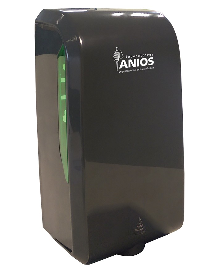 Distributeur manuel gris à accrocher au mur à l’aide de 4 vis, avec bouton poussoir pour flacon d’1L CPA d’ANIOSGEL 85 NPC, ANIOSGEL 800, ANIOSAFE SAVON DOUX HF, ANIOSAFE MANUCLEAR HF ou ANIOSAFE MANUCLEAR NPC HF.