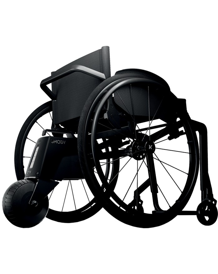 Assistance électrique à la propulsion. Motorisation de 7,2 kg qui se fixe et se retire facilement du fauteuil roulant.