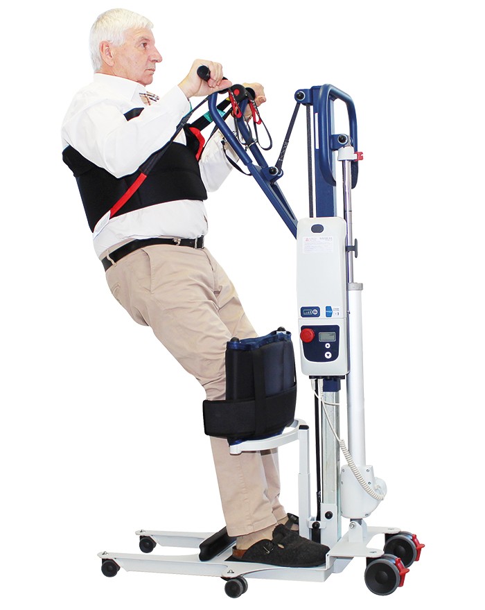 Le déploiement combiné du mât et de la sangle de traction permet de passer de la position assise à la position debout en respectant le plus possible le confort et la pathologie du patient.