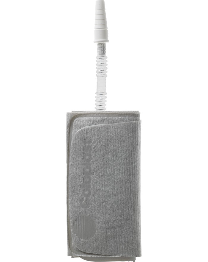 La poche à urine est intégrée dans une bande élastique qui se fixe autour de la cuisse.