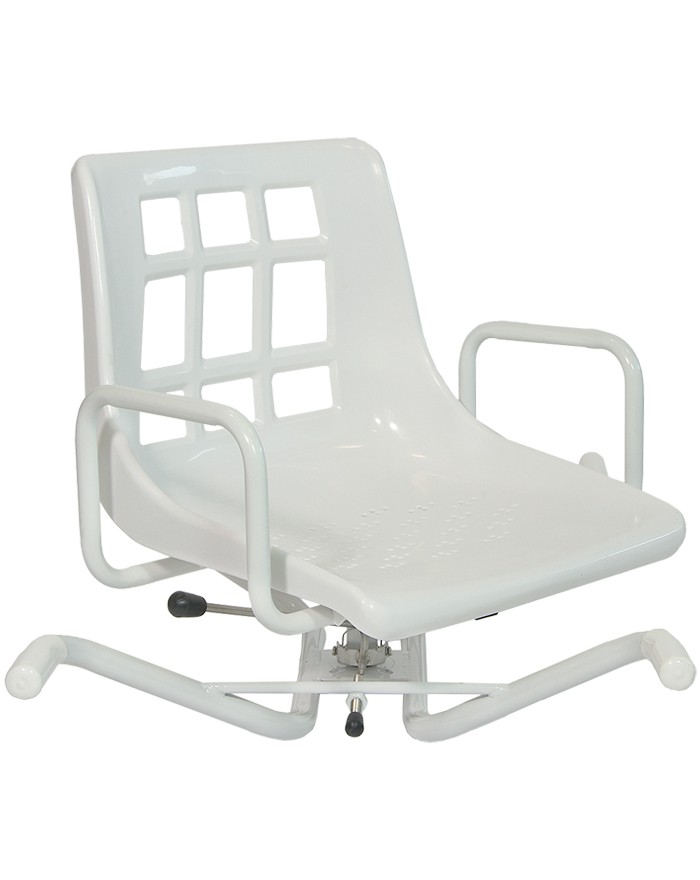 Sièges pivotants sur 360° avec repérage des positions tous les 90°. Parfaitement stables grâce à leurs supports antidérapants. Structure en acier époxy blanc. Accoudoirs fixes ou relevables. Poids max. : 130 kg.
